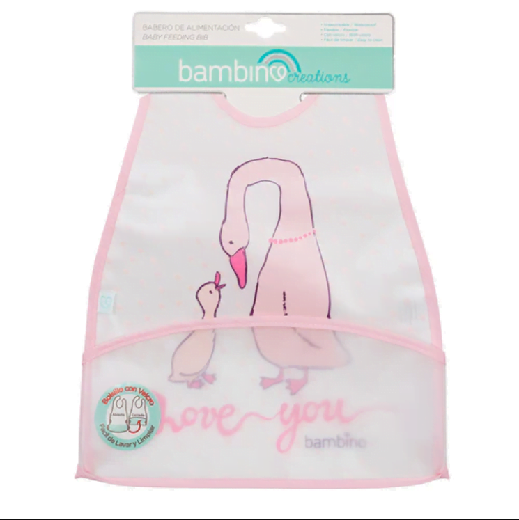 Los baberos de PEVA de Bambino son muy prácticos a la hora de comer, ya que son extremadamente impermeables. Tienen un bolsillo que protege a tu bebé de cualquier caída de comida, de esta forma, siempre estarán limpios y secos después de comer. El bolsillo es desplegable y se abre completo para una mejor limpieza. Te sugerimos lavarlo a mano.